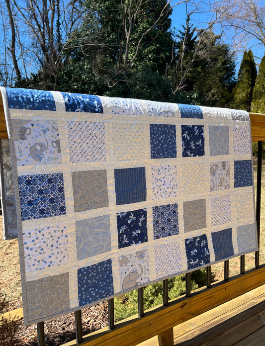 Handmade Baby Boy Quilt, Baby Boy Blanket, Adorable Bunnies, Elephants in Blue, Grey, White (38x43) Ready to Ship!
