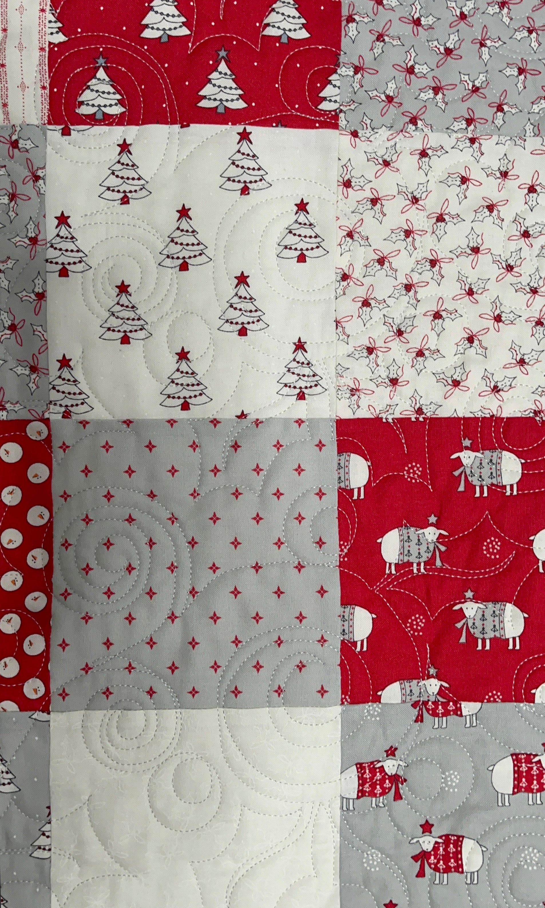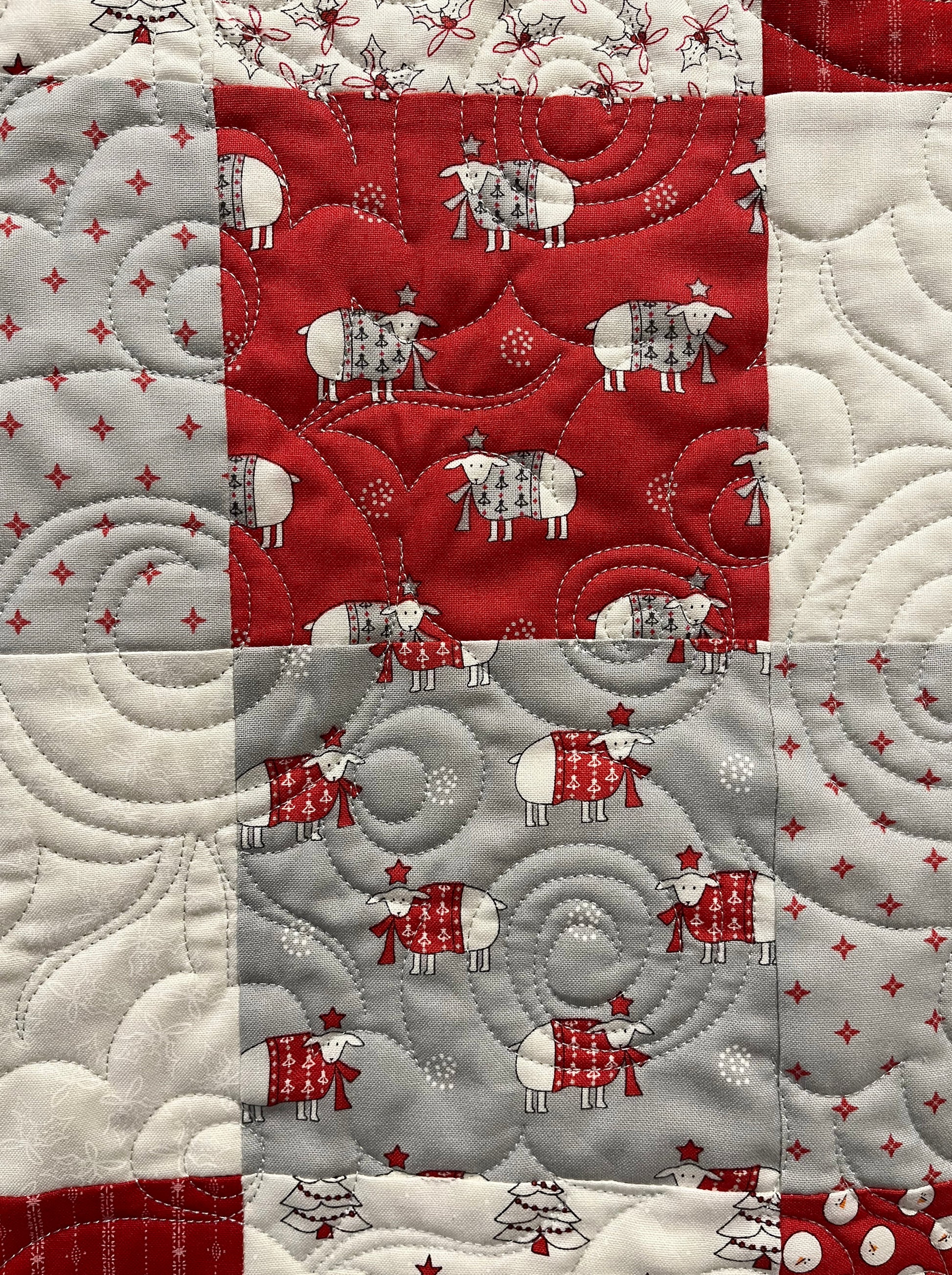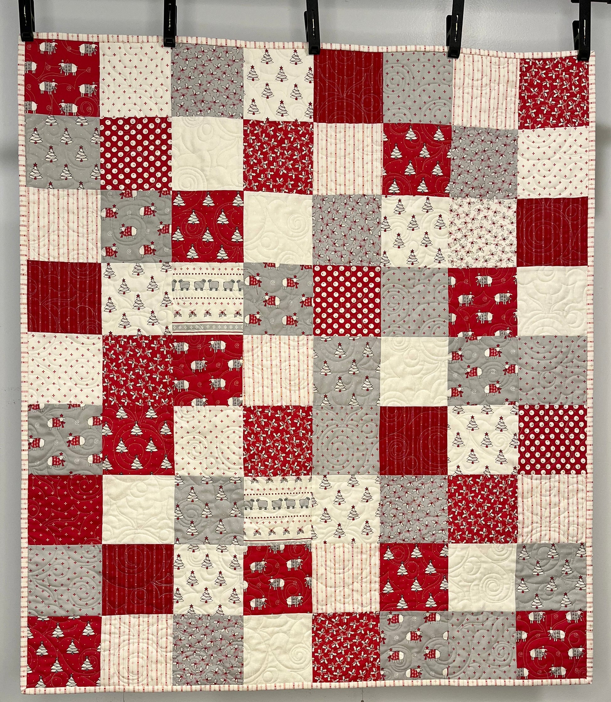 Super soft whimsical quilt with adorable little lambs in their Christmas sweaters. The front includes not only the sheep in grey and red, but Christmas trees, holly, stars, candy cane stripes and more. This really is an adorable line of fabric from Moda and is no longer available. As with all my fabric, I have stored it in sealed, air-tight containers out of the sunlight.