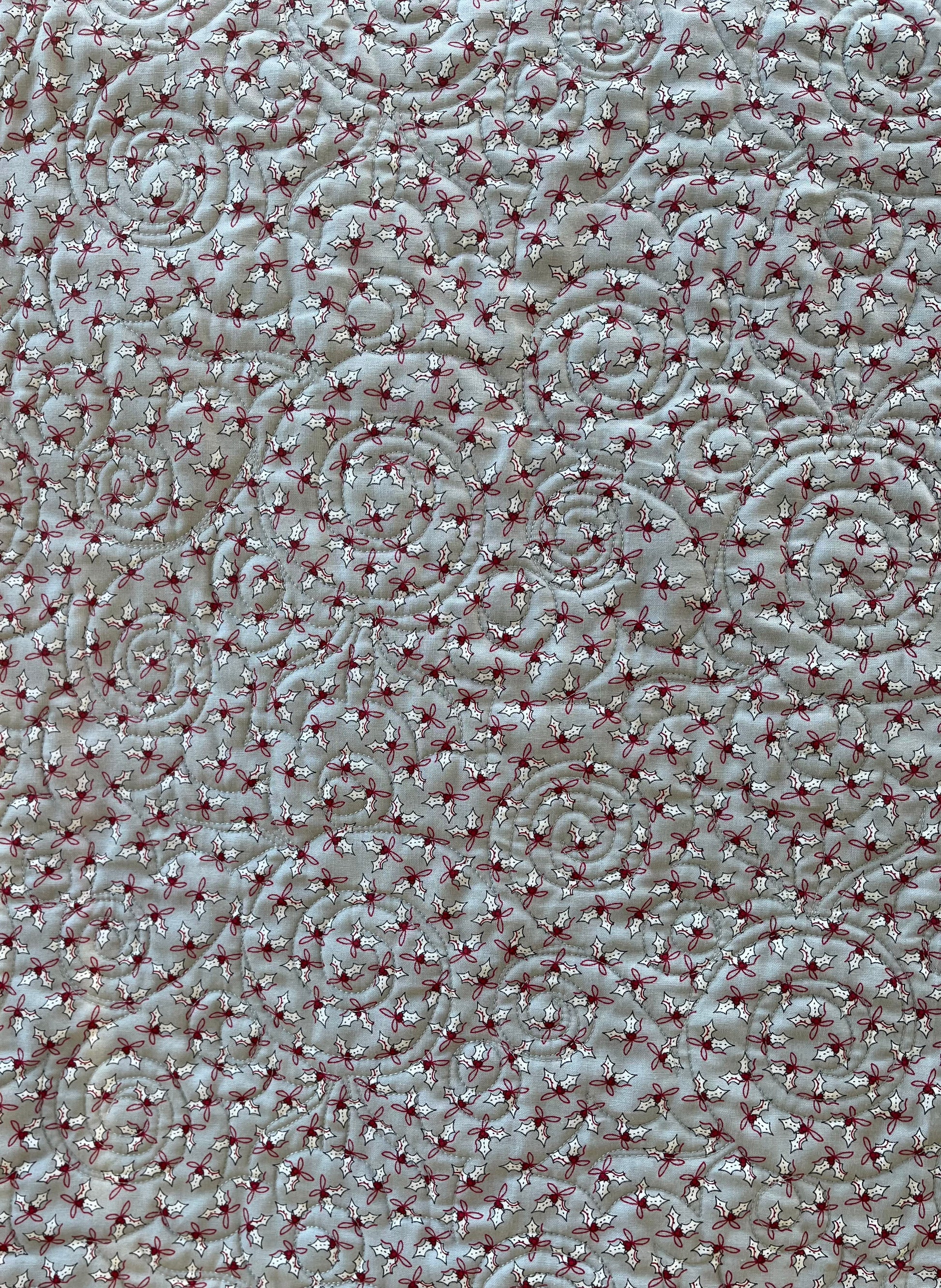The all-over quilting is done in a pattern of holly leaves, berries and swirls to coordinate with the prints on the quilt.