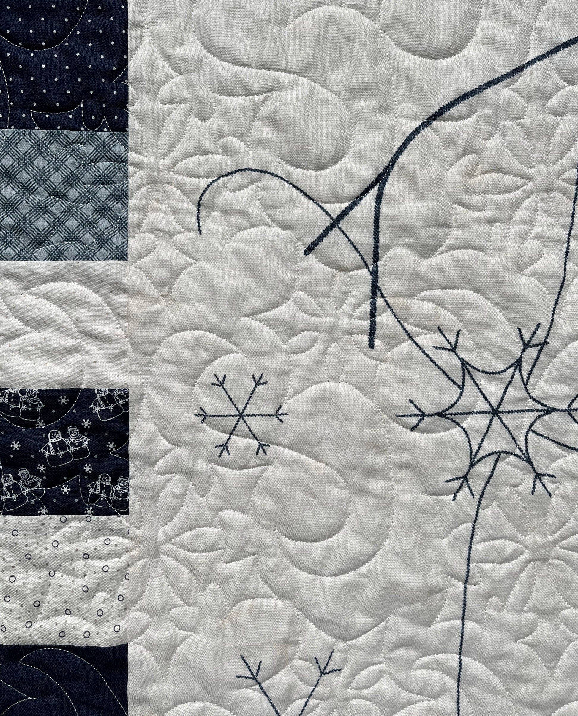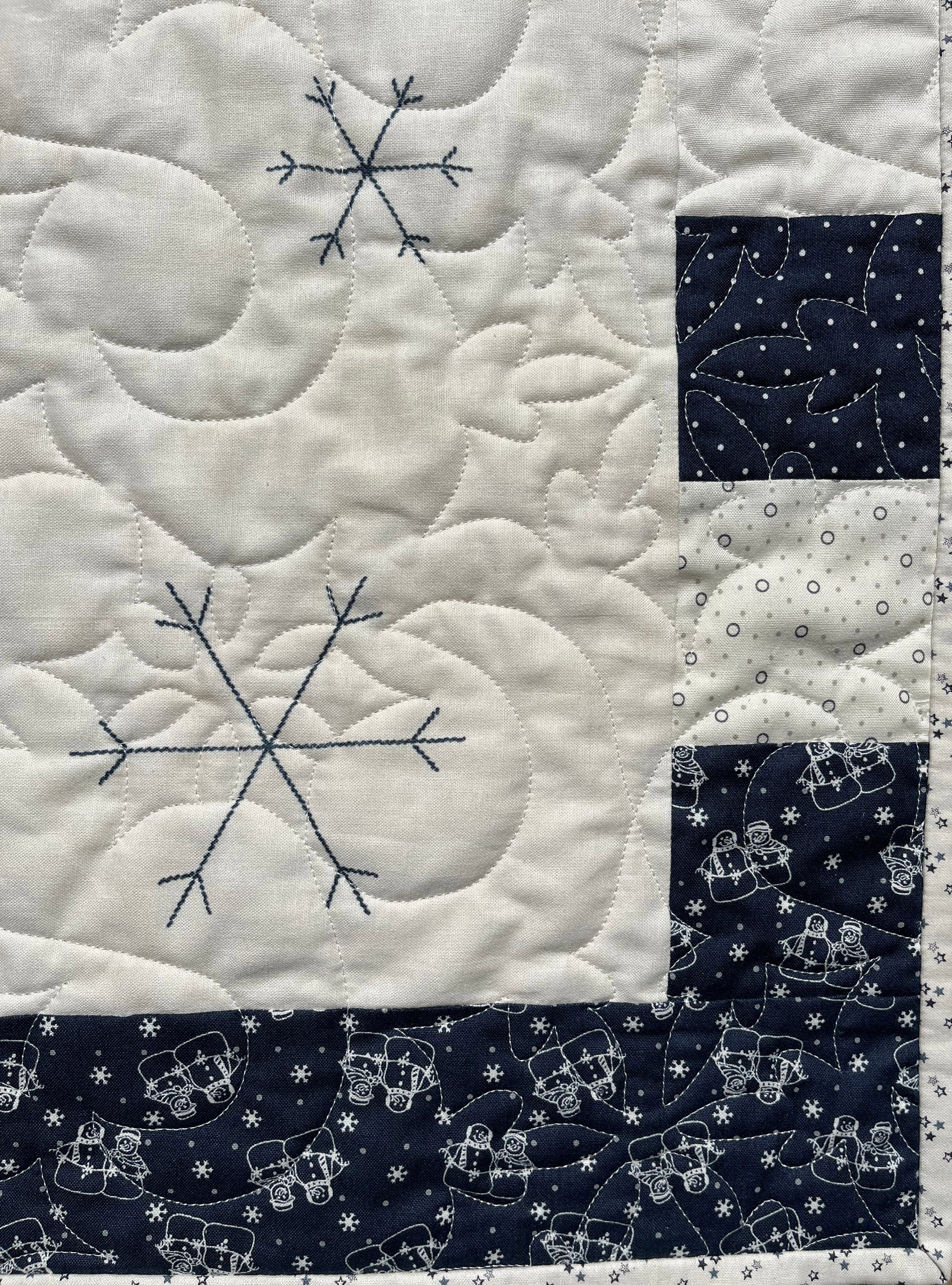 The backing is navy with cream snowmen. The handmade binding is in a matching cream with stars, doubled for strength, stitched on by machine and finished with a blind hand stitch for that fine finishing touch.